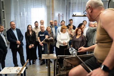 A nap első része gyárunkban, Halimbán kezdődött, ahol a vendégek betekintést nyertek a kristálypoharak készítésének folyamatába. A látogatók megtapasztalhatták, hogyan válik a kvarchomok közel 1500°C-os hőmérsékleten folyékony üveggé. A forró üvegmassza formálása igazi művészet, amelyet szakembereink elképesztően összehangolt mozdulatokkal végeznek. Az üvegfúvó a fúvócső segítségével fújja buborék alakúra az üvegolvadékot, majd egy faformába helyezi, amelyet előzőleg a pohár pontos alakjára esztergáltak. Az elkészült poharakat ezután lassan hűtőszalagon hűtjük, hogy elkerüljük a feszültségek kialakulását, majd gondos kezek pattintják le a „kapnit”, csiszolják és égetik be a szájperemet, hogy tökéletes felületet kapjanak. A szigorú minőségbiztosítási rendszerünk mellett, gyakorlott minőségellenőreink garantálják, hogy csak a legjobb darabok kerüljenek a fogyasztók asztalára. A bátrabb vendégeinknek lehetőségük volt az üvegfújás kipróbálására is.